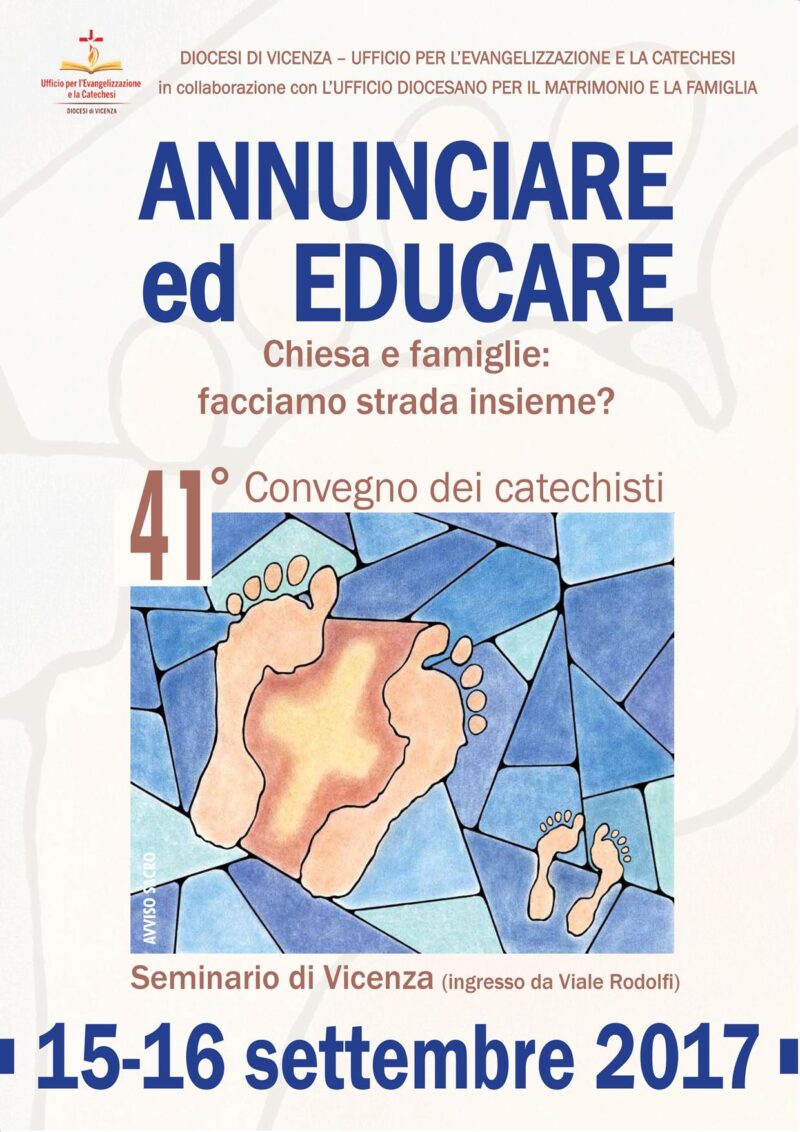 Si svolgerà il 15 e 16 settembre 2017 il 41° convegno dei catechisti della diocesi di Vicenza. Quest’anno il convegno sarà in collaborazione con l’ufficio per la famiglia ed il matrimonio e toccherà temi che interessano a catechisti, educatori, animatori…e genitori!!!Scarica la locandinaClicca qui per le iscrizioni online Interverranno durante il convegno: Mons. Paolo Sartor Presbitero dell’Arcidiocesi di Milano, dal 2014 è il direttore dell’Ufficio Catechistico Nazionale. E’ responsabile del Servizio diocesano per il Catecumenato; docente presso l’Istituto Superiore di Scienze Religiose di Milano e responsabile nazionale del Settore del Servizio per il Catecumenato. Interviene venerdì 15 settembre alle 15.00 sul tema “La gioia del Vangelo: l’annuncio, la catechesi e le famiglie con Papa Francesco”. Don Dario Vivian Presbitero della diocesi di Vicenza, è stato fino al 2004 direttore dell’Ufficio catechistico diocesano. Insegna alla Facoltà Teologica del Triveneto. Ecclettico, appassionato di arte, cerca di interpretare le opere d’arte con un approccio teologico e spirituale. Interviene venerdì 15 settembre alle 20.30 in dialogo con don Paolo Sartor sul tema “Famiglie e comunità: come cambia la catechesi”. Assunta Steccanella Teologa di origini vicentine, ha conseguito il Dottorato alla Facoltà Teologica del Triveneto. E’ membro del Coordinamento delle Teologhe Italiane. Insegnante fino al 2010 in un liceo, attualmente si dedica alla ricerca. Sposata e madre di tre figli. Sabato 16 settembre guida uno dei lavori di gruppo per genitori, catechisti ed educatori di ragazzi che frequentano la scuola primaria sul tema “Coinvolgere genitori e figli nel percorso di fede”. Stefano Coquinato Pedagogista clinico counselor, formatore, di origine vicentine, si occupa prevalentemente di minori e giovani. Interviene sabato 16 settembre con una proposta sul tema “Coinvolgere genitori e figli nel percorso di fede” e anima la tavola rotonda dove intervengono varie figure educative che incontrano ragazzi e ragazze preadolescenti.