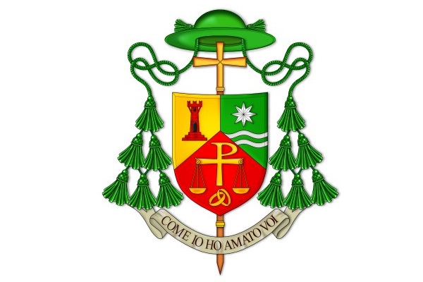 Lo stemma del Vescovo mons. Pierantonio Pavanello carica le figure araldiche della torre, della stella ottagona, di una gemella, di una croce che si tramuta in bilancia e di due anelli nuziali, mentre, per motto, porta la frase del Vangelo di Giovanni (15,12), “come io ho amato voi”. La torre richiama le figure araldiche presenti negli scudi civici di Bassano del Grappa – città natale del presule – e di Adria – sede episcopale primigena della diocesi di Adria – Rovigo – oltre a ricordare i titoli mariani della litanie lauretane “Torre di Davide” e “Torre d’avorio”. La stella del mattino richiama, invece, Maria, che sempre lo ha accompagnato con pazienza ed affetto, come una buona mamma. La stella ottagona, simboleggia, altresì, le otto beatitudini evangeliche. La “gemella” – termine araldico che si rappresenta con due strisce parallele, a forma di onde marine basse – simboleggia i fiumi Adige e Po che intersecano il territorio della diocesi di Adria-Rovigo. La croce, richiama, invece, al novello presule che al centro della vita di ogni ministro ordinato e della sua stessa vita c’è Cristo, mentre la bilancia ricorda la specializzazione in diritto canonico e per molti anni l’esercizio dell’ufficio di giudice nel Tribunale Ecclesiastico. Le fedi nuziali, infine, simboleggiano la spiritualità sponsale che il Vescovo Pierantonio ha coltivato con molte coppe di sposi in percorsi di formazione e nella Comunità di Incontro Matrimoniale nonché l’auspicio di portare nella Chiesa di Adria-Rovigo uno stile “sponsale”. Alla dimensione “sponsale” si ricollega anche il motto “Come io ho amato voi”, che riprende il comandamento nuovo lasciato da Gesù ai suoi discepoli (Gv. 15,12): è il programma di vita di ogni cristiano e quindi anche del Vescovo e ci indica la motivazione per cui dobbiamo amare (in Gesù morto e risorto abbiamo ricevuto l’amore di Dio) e il modo in cui amare (Gesù ci ha amato sino alla fine, donando tutto se stesso). La blasonatura e l’esegesi sono dell’araldista Giorgio Aldrighetti di Chioggia (Venezia), mentre Enzo Parrino di Monterotondo (Roma), ha curato l’ideazione, con le miniature dello stemma a colori e a tratto.