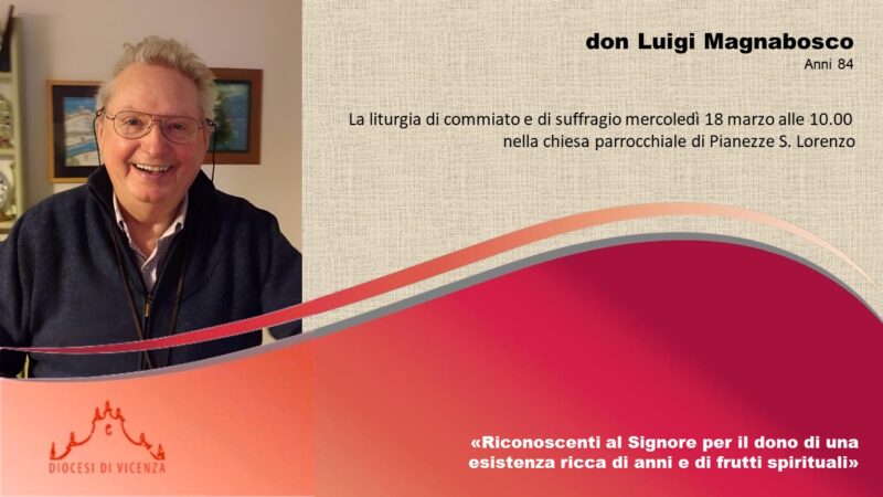 Il Vescovo di Vicenza, Mons. Giuliano Brugnotto, il Vescovo emerito, Mons. Beniamino Pizziol, il presbiterio diocesano, assieme alla sorella Giannina, ai nipoti, ai pronipoti e ai familiari tutti, annunciano, con dolore illuminato dalla fede, la morte di