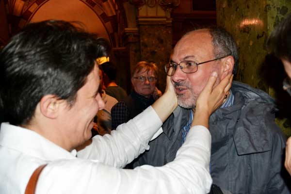 L’abbraccio dei fedeli vicentini a don Gianantonio Allegri dopo la veglia di venerdì 6 giugno 2014 a Monte Berico