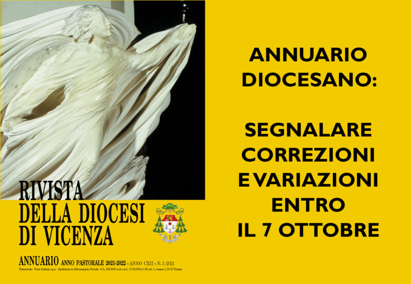 Si richiede a quanti sono interessati, in particolare i parroci e i responsabili delle comunità religiose, di segnalare entro il 7 ottobre alla Segreteria della Cancelleria Vescovile (referente Sig.ra Anna – tel. 0444226343 – e-mail a.bernardi@diocesi.vicenza.it) eventuali correzioni e/o variazioni riguardanti nominativi, incarichi, indirizzi e recapiti telefonici.