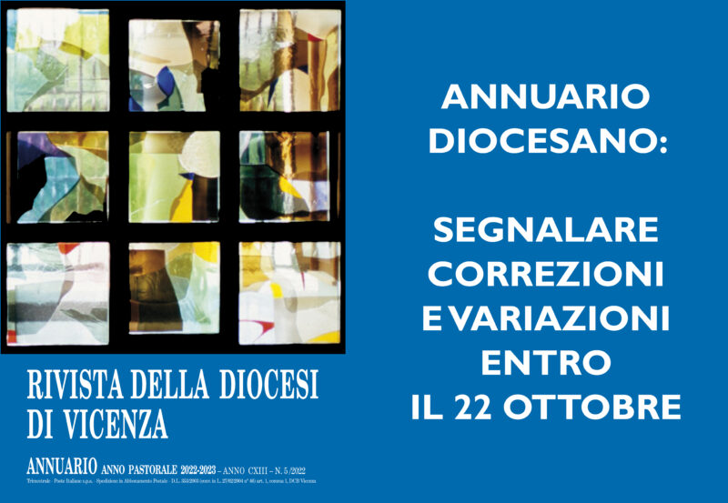 Si richiede a quanti sono interessati, in particolare i parroci e i responsabili delle comunità religiose, di segnalare entro il 22 ottobre alla Segreteria della Cancelleria Vescovile (referente Sig.ra Anna – tel. 0444226343 – e-mail a.bernardi@diocesi.vicenza.it) eventuali correzioni e/o variazioni riguardanti nominativi, incarichi, indirizzi e recapiti telefonici.