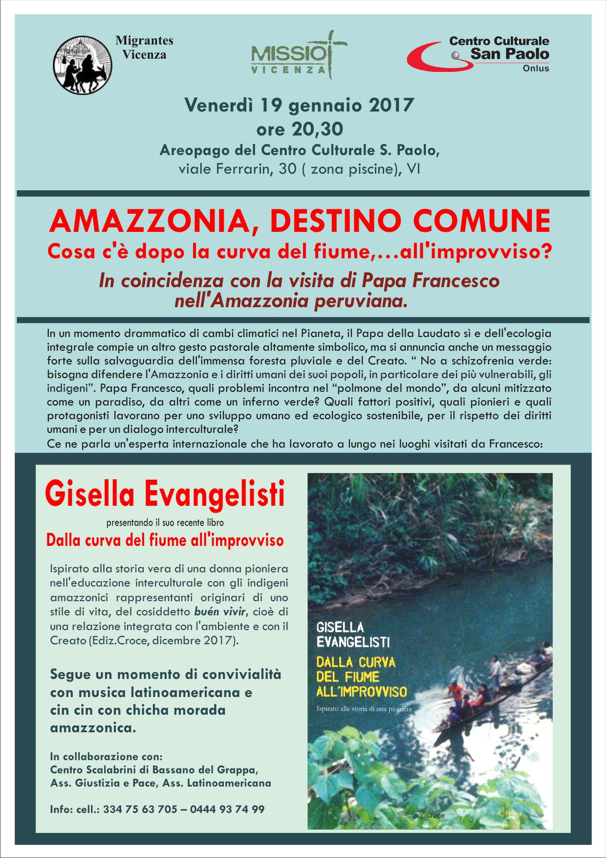 Per approfondire questi temi ed in sintonia con il prossimo viaggio del Pontefice, la scrittrice ed antropologa vicentina Gisella Evangelisti presenta il suo ultimo libro”Dalla curva del fiume all’improvviso” venerdì 19 gennaio alle 20,30 al Centro Culturale San Paolo.