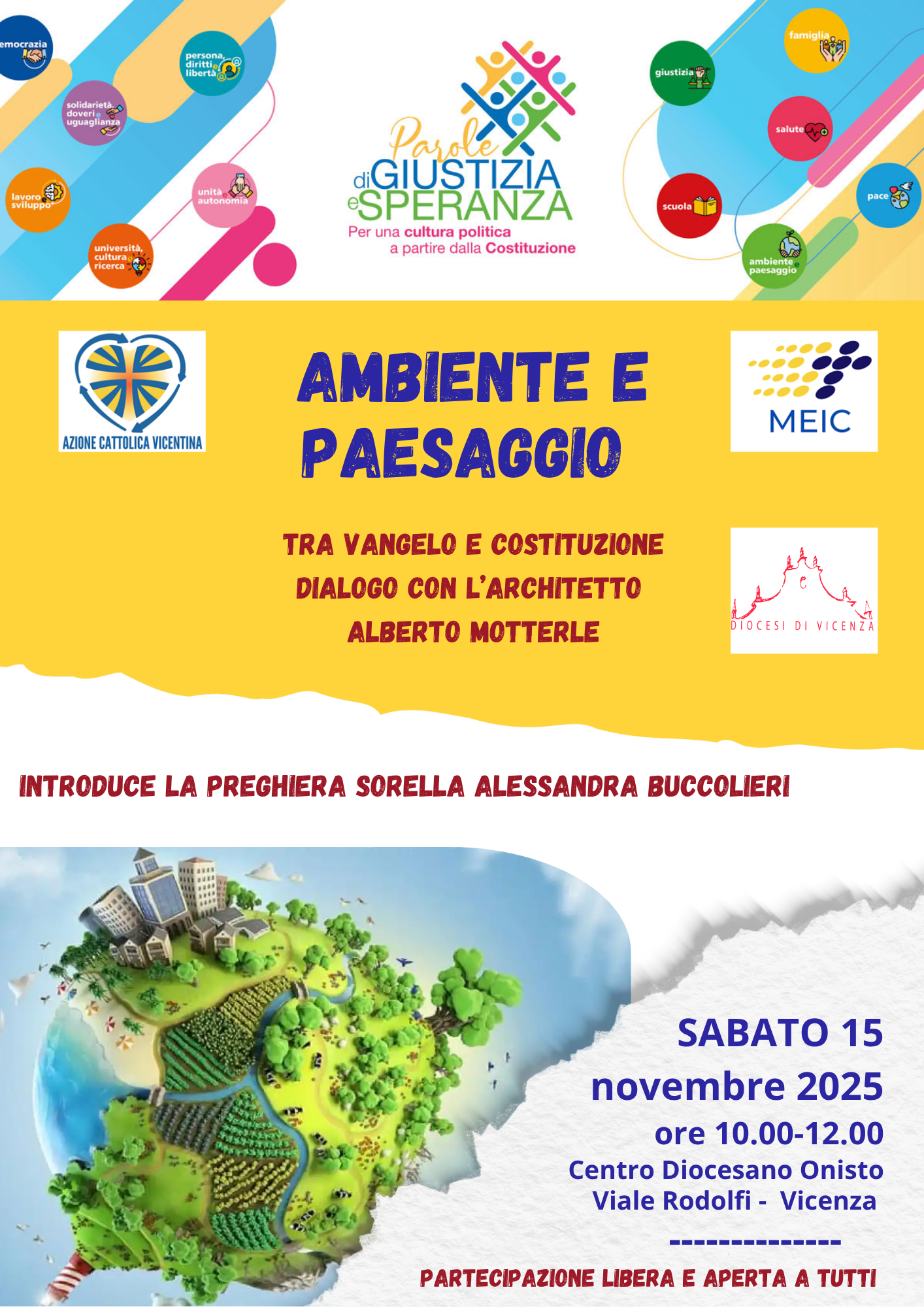 In particolare grazie all’architetto Alberto Motterle ci si concentrerà sul rapporto tra ambiente e paesaggio, elementi fondamentali per permettere all’uomo di vivere in una condizione di benessere e felicità. Sullo sfondo, l’articolo 9 della Costituzione e, appunto, l’enciclica Laudato Sii. Aprirà i lavori la preghiera e il commento della Parola, grazie al contributo di Alessandra Buccolieri di casa Betania. La partecipazione è libera e aperta a tutti. L’appuntamento è per SABATO 15 NOVEMBRE, dalle 10.00 alle 12.00 in sala dei Consigli, Centro Onisto, Vicenza.