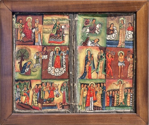 Il dittico, una tempera su tavola con imprimitura in tela gessata (cm 30×36,5 aperta), descrive Episodi della vita di Cristo e dei miracoli di Maria; due santi cavalieri. L’opera si può datare ai secc. XVIII-XIX, la provenienza specifica e il nome dell’artista sono sconosciuti ma stilisticamente l’opera rimanda al secondo stile di Gondar. Questo stile, si sostituisce al primo stile di Gondar, dall’inizio del XVIII secolo. Artigiani stranieri originari del Vicino Oriente si stabilirono a Gondar (un’antica capitale imperiale dell’Etiopia e della provincia storica del Begemder, attualmente parte della regione di Amhara “. La città si trova a nord del Lago Tana, sulle rive del fiume Angereb e a sud-ovest delle monti Semièn) ed ebbero il patrocinio dell’imperatore Iyasu II (1730-55) come anche si sua madre, l’imperatrice Mentewwāb. Le opere di questa produzione sono dipinte e incorniciate utilizzando modelli e tecniche europee. Quattro sono gli elementi caratteristici della produzione delle tavole dipinte del XVIII in queste zone. Uno di questi è rappresentato da trittici e dittici eccezionalmente gradi con scene multiple della vita e della passione di Cristo, della vita di Maria o del martirio di san Giorgio; un secondo elemento chiave è costituito dalla tendenza generale a rappresentare figure di supplici nei dipinti da loro commissionati; in terzo luogo, si registra un largo uso di fazzoletti portati da varie figure come segni di distinzione; infine va rilevato l’uso selettivo fi nimbi o aureole.L’opera fa parte della collezione etnografica del Museo Diocesano di Vicenza, ed è visitabile previa prenotazione contattando il Museo Diocesano (0444-226400)