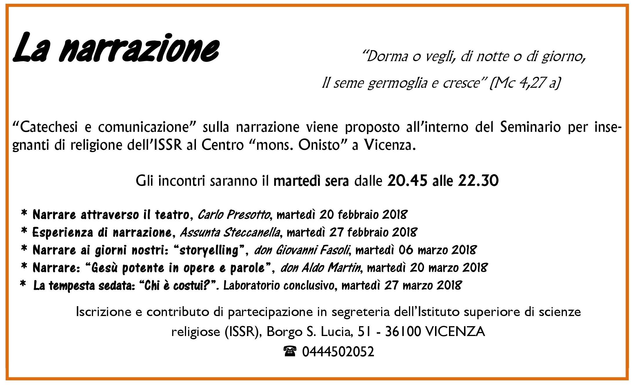 Annuncio, catechesi 8 Febbraio 2018 sEEd_aDm_wP “Catechesi e comunicazione”: corso sulla Narrazione Dal 20 febbraio alle 20.45 al Centro Onisto Viene riproposto il corso “Comunicazione e catechesi” sulla Narrazione. Dal 20 febbraio 2018 dalle 20.45 alle 22.30 al Centro Onisto. Scarica la locandina FacebookPinterestTwitterLinkedin NEWS20CATECHESI203020-203120gennaio202018-page-1-Copia-1