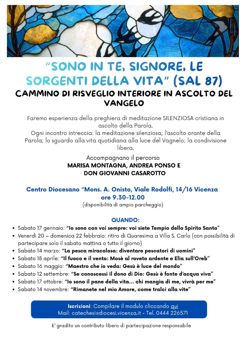 Proposta biblica e percorso di preghiera interiorizzata con la meditazione cristiana a cura di Marisa Montagna, Andrea Ponso e Don Giovanni Casarotto. La proposta è rivolta a tutti coloro che vogliono regalarsi un tempo di preghiera all’inizio della Quaresima. Da venerdì 20 febbraio a domenica 22 febbraio 2026 a Villa S. Carlo – Costabissara. Iscrizioni entro il 15 febbraio: https://forms.gle/cUwnxt8jQU5Efh7n7