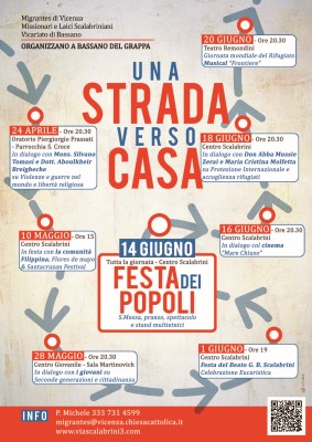 Il 20 giugno si celebra la Giornata Mondiale del Rifugiato indetta dall’ONU. Per questa occasione anche questo anno a Vicenza, la Migrantes si unisce al Centro Astalli, alla Chiesa Evangelica Metodista, alla Associazione Presenza Donna e a Caritas Vicentina nella organizzazione dell’iniziativa che questo anno porta il titolo: Rifugiati, artigiani di pace.La pace prima di essere un traguardo è un cammino, spesso in salita, fatto … Continua a leggere