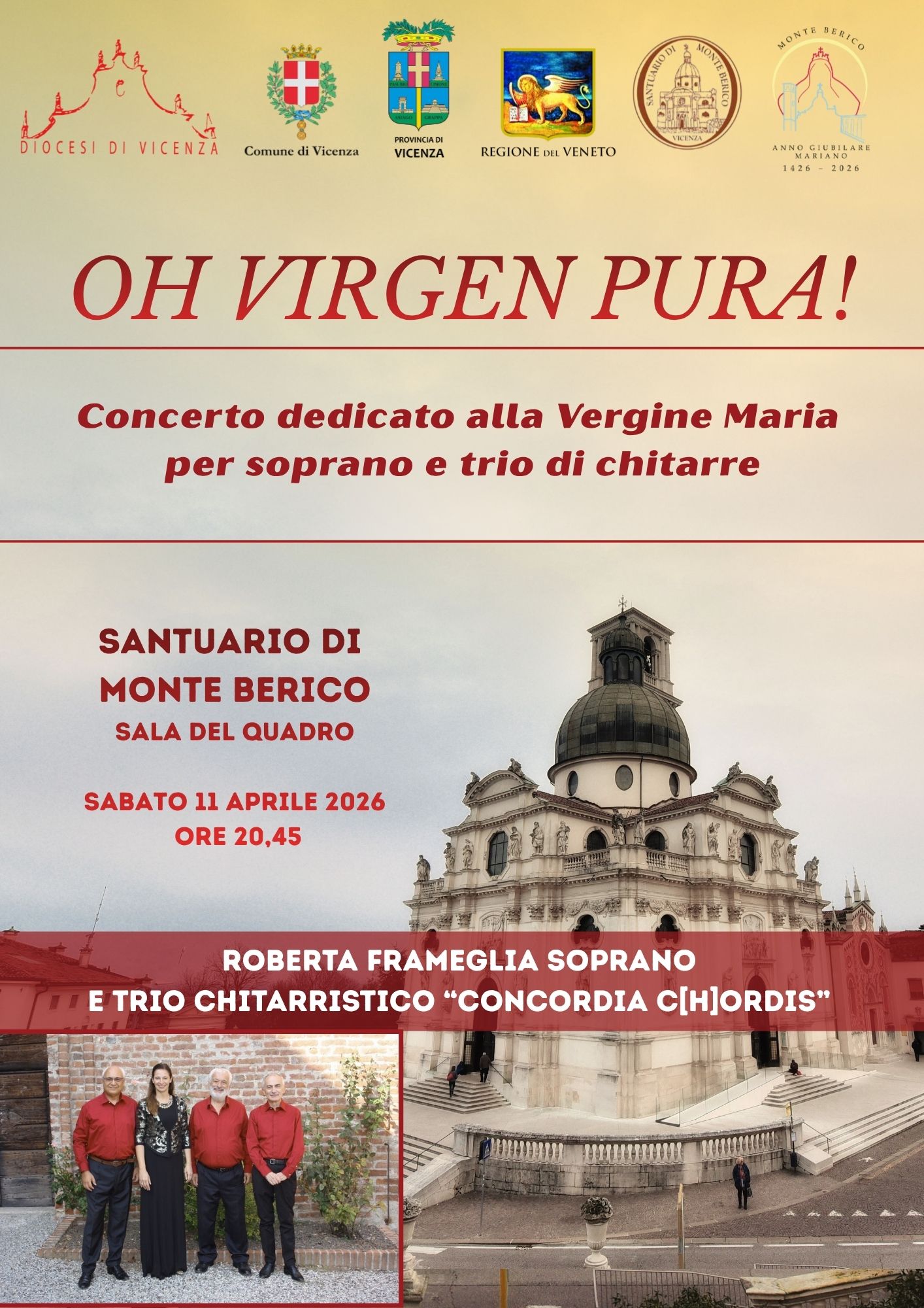 Nell’ambito dell’Anno Giubilare Mariano, sabato 11 aprile 2026 alle 20.45 nella Sala del Quadro del Santuario di Monte Berico, la diocesi di Vicenza propone il concerto «OH VIRGEN PURA!» per soprano, Roberta Frameglia, e trio di chitarre, «Concordia C[h]ordis». Ingresso libero.