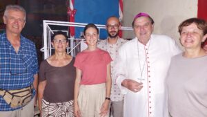 Inoltre all’alba una piccola delegazione del nostro gruppo, 8 pellegrini, è salpata con un battello ben stipato alla volta di Baraka, la via più “veloce” (5 ore) per il paese dove sono sepolti fratel Faccin e padre Carrara. Un messaggio ci comunica che sono stati accolti con canti vivacissimi! Vivranno due giorni in quella comunità, intrisa di ricordi dei nuovi beati”.