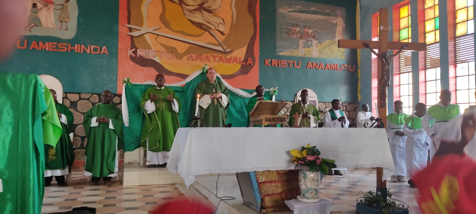Don Andrea Bruttomesso ha scritto qualche riflessione sulle ultime due giornate africane: “La giornata di lunedì 19 agosto è stata coronata dalla messa di ringraziamento presso il santuario di Kavimvira. Il vescovo di Uvira Sébastien-Joseph Muyengo, provato dalla stanchezza, ha presieduto l’Eucarestia in una chiesa colma di fedeli in festa. Significativo è stato il battesimo di tre bambini, tre piccoli della famiglia del martire Joubert, in questo luogo dove sono riposte le reliquie dei nostri martiri congolesi: il dono della loro vita sta davvero portando frutti di vita nuova! Padre Fernando Garcia, generale dei Saveriani, ha salutato tutti i presenti, motivandoli a prendere il testimone di questi fratelli martiri e portarlo avanti “alla loro altezza”: all’altezza della fiducia e dell’amore che Gesù pone in ciascuno di noi! Incisivo il richiamo finale del Vescovo Muyengo ai cristiani della città a ricordare la data del 18 agosto 2024 come un “Anno Domini congolese”, una giornata in cui davvero possa iniziare un’era nuova per i cristiani del Congo: un tempo di costruzione di pa