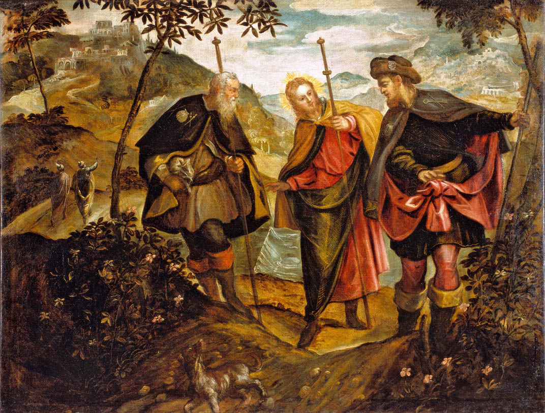 La tela è opera di Domenico Tintoretto in deposito al Museo Diocesano da IPAB di Vicenza. Il dipinto racconta, con la sua intensa luce e i colori brumosi del paesaggio, il viaggio verso Emmaus quando Gesù accompagna i due apostoli nel cammino ma senza riverlarsi loro. Cristo ha il volto che letteralmente risplende, accanto a Lui i suoi apostoli vestiti da pellegrini e a guidare il cammino un cagnolino festante, simbolo di fedeltà.