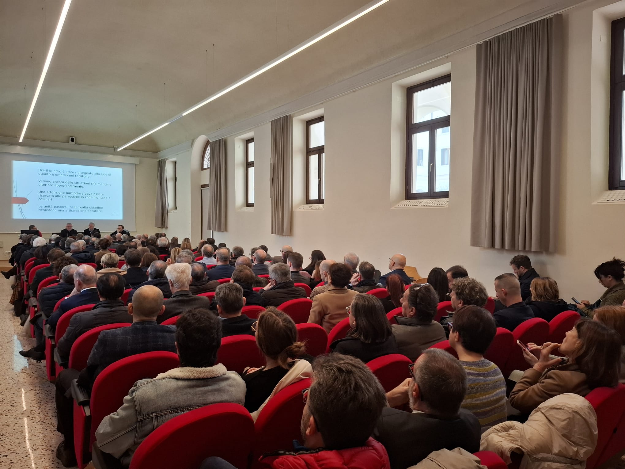Don Flavio Marchesini ha quindi illustrato il percorso realizzato dalla diocesi: nella primavera del 2023 è stata elaborata una prima proposta che è stata quindi presentata nei diversi vicariati tra gennaio e marzo 2024. Da questi incontri alla sono arrivate alla commissione diocesana incaricata sono arrivate proposte, sottolineature, riflessioni, anche da singole parrocchie e unità pastorali. Tra la fine di settembre e la fine di novembre 2024, è stato realizzato il secondo giro di ascolto e confronto nei 14 vicariati. In questi incontri si sono quindi dipanate le diverse prospettive di cambiamenti e accorpamenti tra parrocchie ed unità pastorali della diocesi.