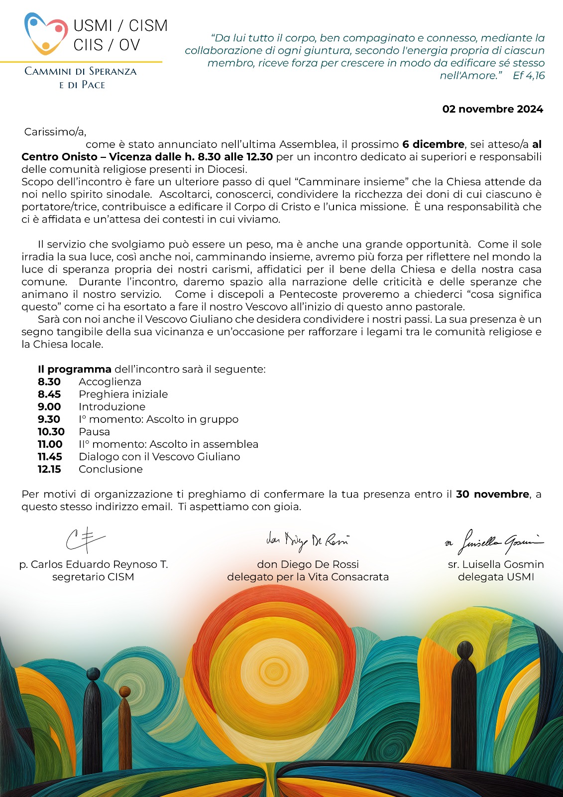 Il prossimo 6 dicembre al Centro diocesano Onisto di Vicenza dalle 8.30 alle 12.30 USMI e CISM diocesani invitano i superiori e responsabili delle comunità religiose presenti in diocesi per un incontro. Interverrà anche il vescovo Giuliano.