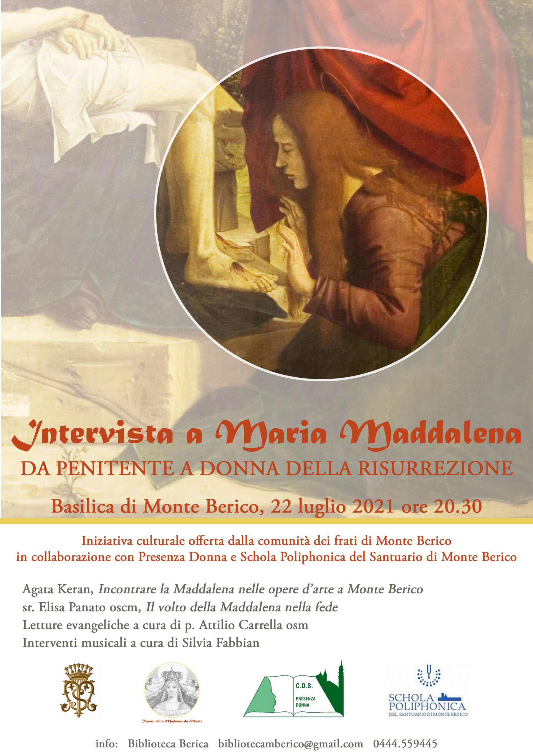 Agata Keran, storica dell’arte impegnata da anni nella valorizzazione del patrimonio artistico e culturale di Monte Berico e curatrice dell’attuale allestimento museale, presenterà al pubblico tre ritratti della Maddalena custoditi nel santuario: ai piedi della croce in una scultura lignea del primo Settecento attribuita alla bottega di Andrea Brustolon; partecipe al compianto di Gesù nella pala cinquecentesca di Bartolomeo Montagna; raffigurata come penitente in contemplazione in un dipinto seicentesco destinato alla devozione privata.