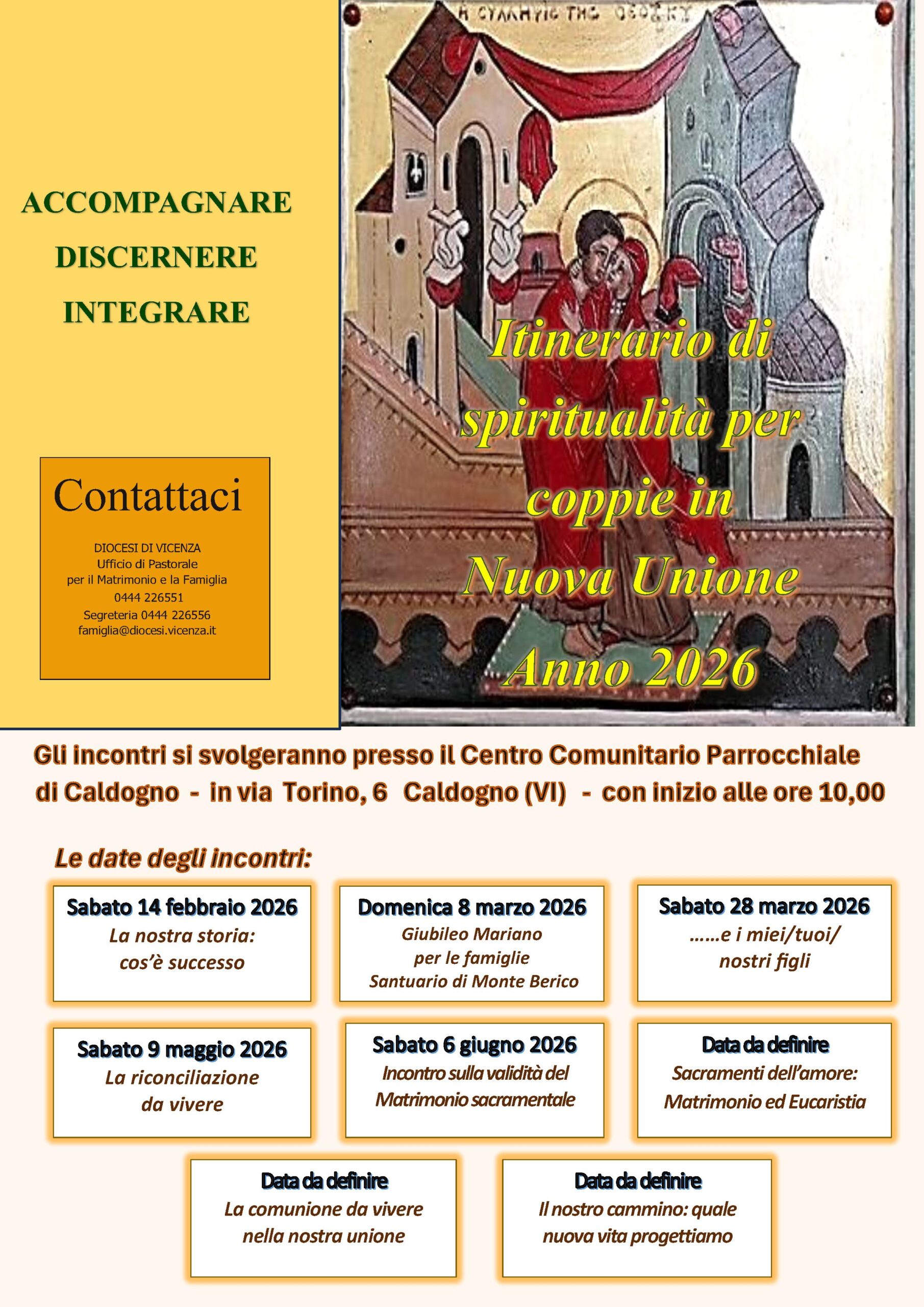 Con gratitudine a Dio e all’accurato e generoso impegno dell’equipe che anima, l’ufficio diocesano per la Pastorale del Matrimonio e la Famiglia propone alcuni incontri mensili il sabato mattina, presso il Centro Comunitario Parrocchiale di Caldogno (VI).