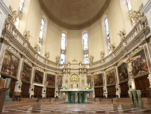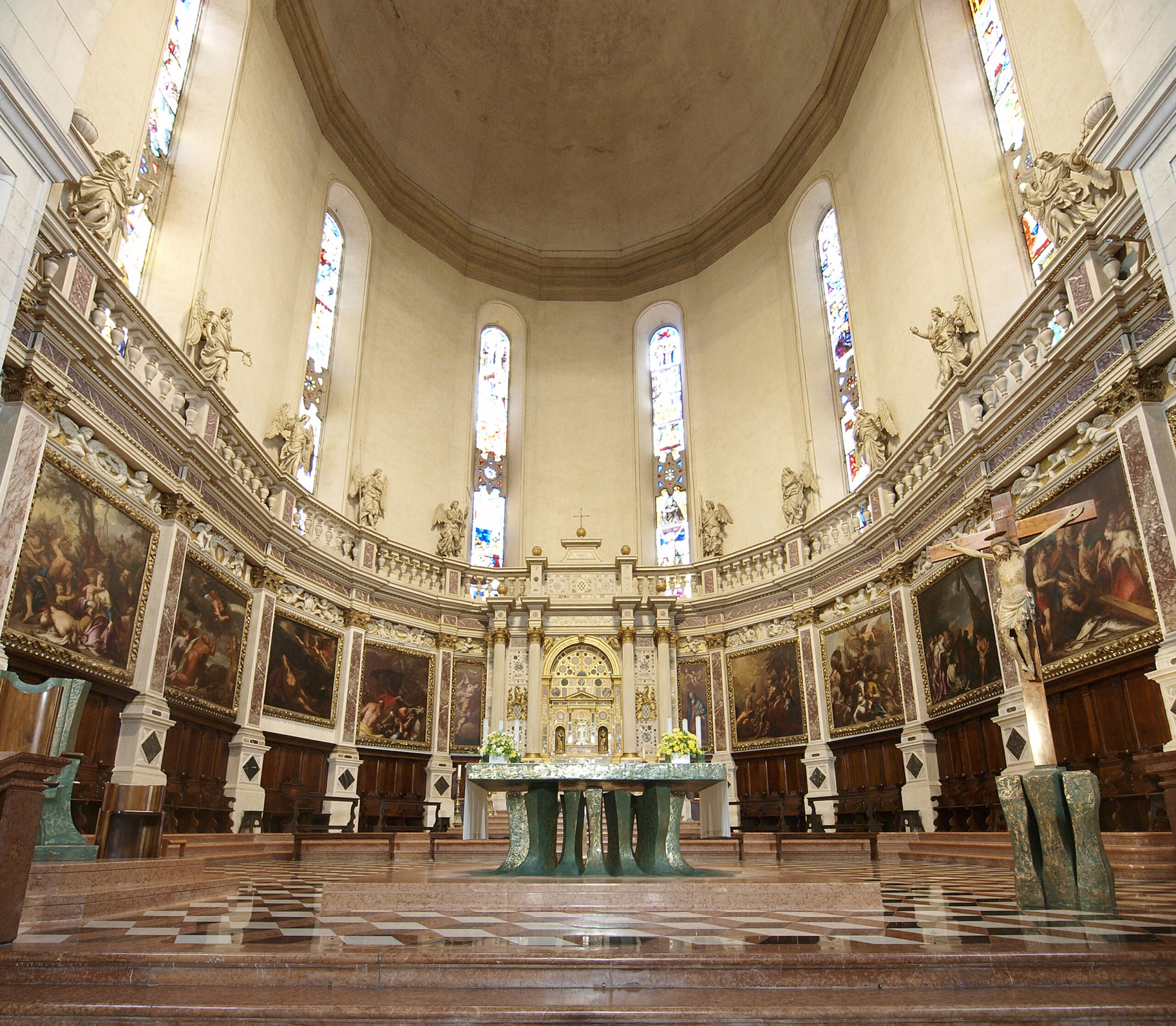 Nell’ottavo decennio del sec. XV, il progettista Lorenzo da Bologna si impegna nel dare vita alla nuova cappella maggiore del Duomo, cui subentra (1482) nell’esecuzione dei lavori Angelo da Verona che abbandona l’anno seguente. Nel 1505 è la volta di Bernardino da Milano e Rocco da Vicenza, ma il cantiere si arresta per la guerra di Cambrai. Verso il 1530 terza fase di lavori che trova un’accelerazione quando nel 1538 Vicenza doveva ospitare il Concilio che poi si farà a Trento. Dopo la metà degli anni ’50 abbiamo la fase finale della realizzazione dell’abside, (già con la sua tribuna e la cripta sottostante) con la costruzione del tamburo e della cupola di Palladio (1558-1565). A un’altissima facciata veniva a corrispondere una tribuna altrettanto elevata e una fabbrica che la sequenza delle cappelle accentuava in larghezza.