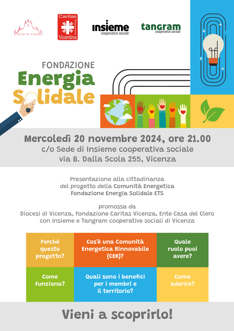 Il progetto, che prenderà presto il via con la costituzione formale della Comunità Energetica Fondazione Energia Solidale ETS e che rappresenta un’iniziativa di grande valore per la promozione della sostenibilità ambientale e dell’inclusione sociale sul territorio, sarà presentato mercoledì 20 novembre alle ore 21 presso la sede di Insieme cooperativa sociale, in via B. Dalla Scola 255 a Vicenza. L’incontro è aperto a tutta la cittadinanza interessata.