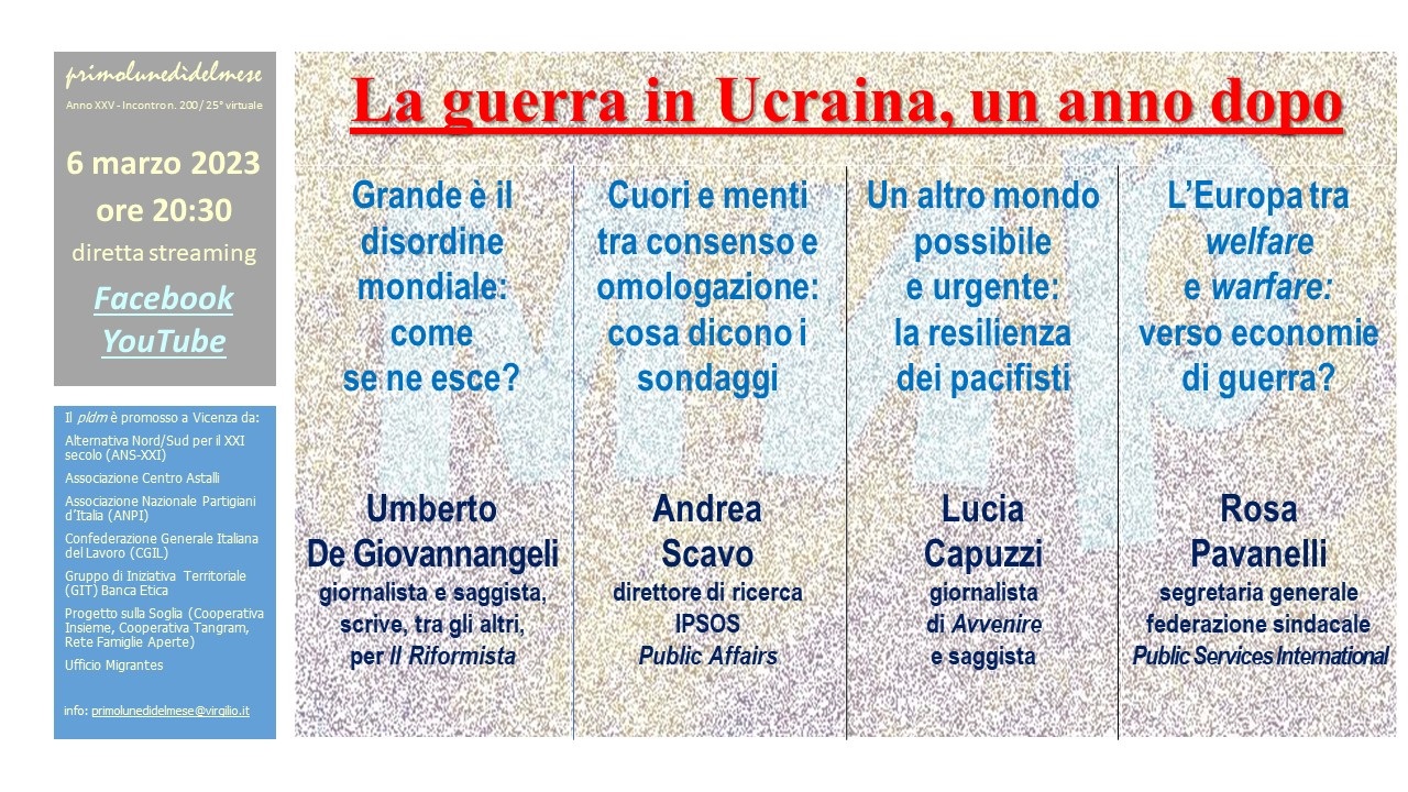 migrantes, Prossimità 24 Febbraio 2023 lbruni La guerra in Ucraina, un anno dopo Primo lunedì del mese 6 marzo 2023 ore 20:30 FacebookPinterestTwitterLinkedin LOCANDINA_primolunedìdelmese