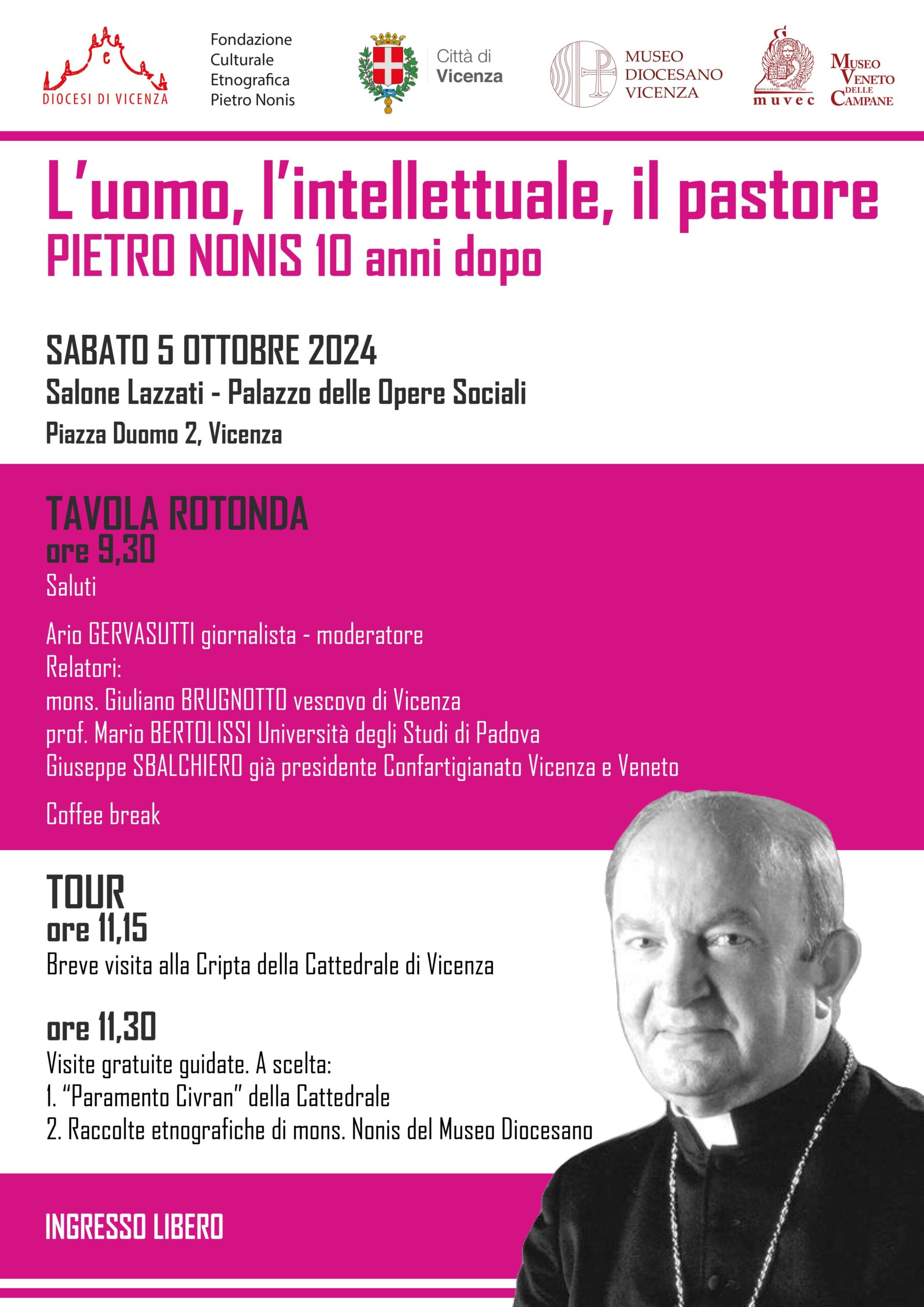 A dieci anni dalla morte di mons. Pietro Giacomo Nonis, già vescovo di Vicenza, deceduto il 15 luglio 2014, la Fondazione Etnografica “P. Nonis” in collaborazione con la Diocesi di Vicenza, il Gruppo “Amici di Nonis”, il Museo Diocesano e il Museo Veneto delle Campane di Montegalda, organizza il 5 ottobre 2024 una tavola rotonda aperta a tutti al Palazzo delle Opere Sociali alle 9,30 moderata dal giornalista Ario Gervasutti, con la partecipazione del vescovo di Vicenza Giuliano Brugnotto, del prof. Mario Bertolissi dell’Università di Padova e di Giuseppe Sbalchiero, già presidente Confartigianato Vicenza e Veneto.