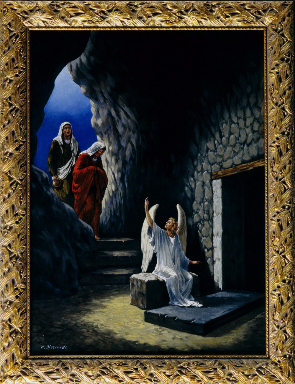 La sorpresa era grande. Quella pietra che separava loro, donne viventi, dalla morte di un uomo reso immobile su di una croce fino all’ultimo respiro, non c’era più. Non vi era più distanza. Potevano nuovamente raggiungerlo, rivederlo. Ma ecco una scoperta ancora più grande e imprevedibile! Entrando nel sepolcro scoprono che non c’è il morto, ma un giovane vivo in bianche vesti; e sono prese da grande spavento! Egli le invita a non avere paura di tutti i massi che pesano sull’esistenza umana. Perché Colui che cercano in pianto, non è più nel sepolcro, è stato risuscitato. “Voi cercate Gesù Nazareno, non è qui!” Colui nel quale le donne avevano posto tante attese e che continuavano a cercare anche da morto, non è più nel sepolcro; è uscito. È fuori dal sepolcro, vivente! E di questa notizia sconvolgente, di quel sepolcro vuoto, delle parole dell’angelo le donne devono subito farsi apostole. Il Vivente, uscito da quella tomba attende i suoi amici ad un nuovo incontro, in Galilea, laddove era iniziata l’avventura dei discepoli.