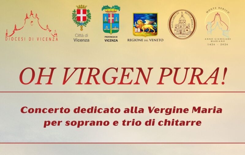 Nell’ambito dell’Anno Giubilare Mariano, sabato 11 aprile 2026 alle 20.45 nella Sala del Quadro del Santuario di Monte Berico, la diocesi di Vicenza propone il concerto «OH VIRGEN PURA!» per soprano, Roberta Frameglia, e trio di chitarre, «Concordia C[h]ordis». Ingresso libero. Il concerto prevede l’esecuzione di uno degli ultimi lavori del gruppo: «Oh Virgen Pura!». Una celebrazione della Vergine Maria a partire da alcuni antichi brani … Continua a leggere