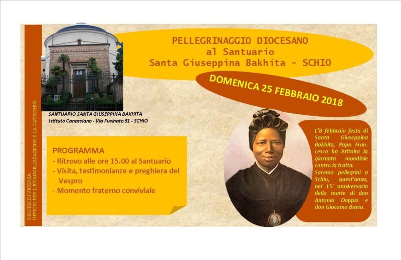 Annuncio, catechesi 3 Febbraio 2018 sEEd_aDm_wP Pellegrinaggio da Bakhita Domenica 25 febbraio 2018 E’ l’occasione per vivere un breve pellegrinaggio insieme sui luoghi dove visse santa Bakhita a Schio. Per tutti i catechisti, ma l’invito si può allargare a chi ha questa sensibilità. Scarica la locandina FacebookPinterestTwitterLinkedin PELLEGRINAGGIO-BAKHITA-2