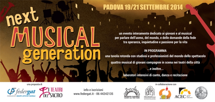 Next Musical Generation è un progetto di Federgat e I Teatri del Sacro in collaborazione con il Servizio Nazionale per il Progetto Culturale, l’Ufficio Nazionale per le Comunicazioni Sociali, il Servizio Nazionale per la Pastorale Giovanile, l’Acec e la Diocesi di Padova.