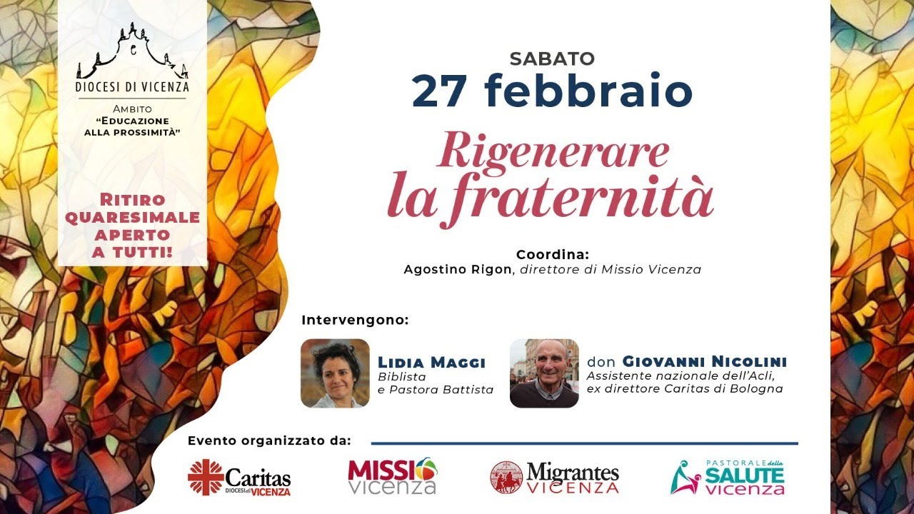 Rigenerare la fraternitàRITIRO DI QUARESIMA proposto dall’ambito Educazione alla Prossimità, online e aperto a tutti. Sabato 27 febbraio dalle 17:00 alle 18:00. La diretta sarà trasmessa dal Canale YouTube della Diocesi (https://youtu.be/1QSzgp50Xc4), dalla pagina Facebook della Caritas e si potrà ascoltare anche su Radio Oreb.Vi aspettiamo tutti e, se potete, passate le informazioni ai vostri amici e conoscenti!