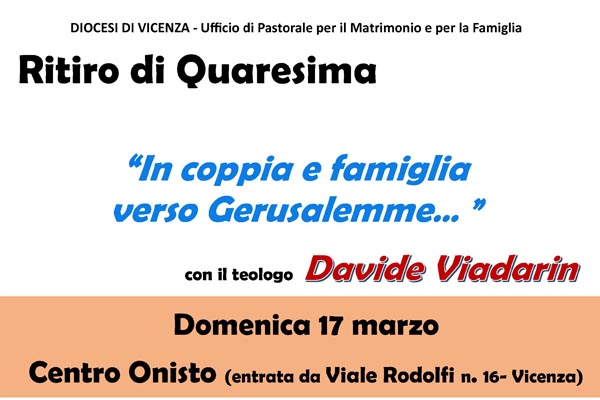 Ritiro di Quaresima “In coppia e famiglia verso Gerusalemme con il teologo  Davide Viadarin Domenica 17 marzo Centro Onisto