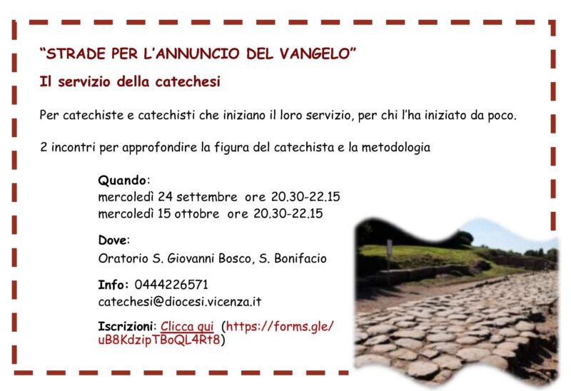 “Strade per l’annuncio del Vangelo” Iniziare il servizio della catechesi   Per catechiste/i che iniziano il loro servizio, per chi l’ha iniziato da poco. 2 incontri per approfonire la figura del catechista e la metodologia Quando:  mercoledì 24 settembre ore 20,30 mercoledì 15 ottobre ore 20.30 Dove: Oratorio S. Giovanni Bosco, S. Bonifacio Info: catechesi@diocesi.vicenza.it   0444 226571 Iscrizioni: Clicca qui