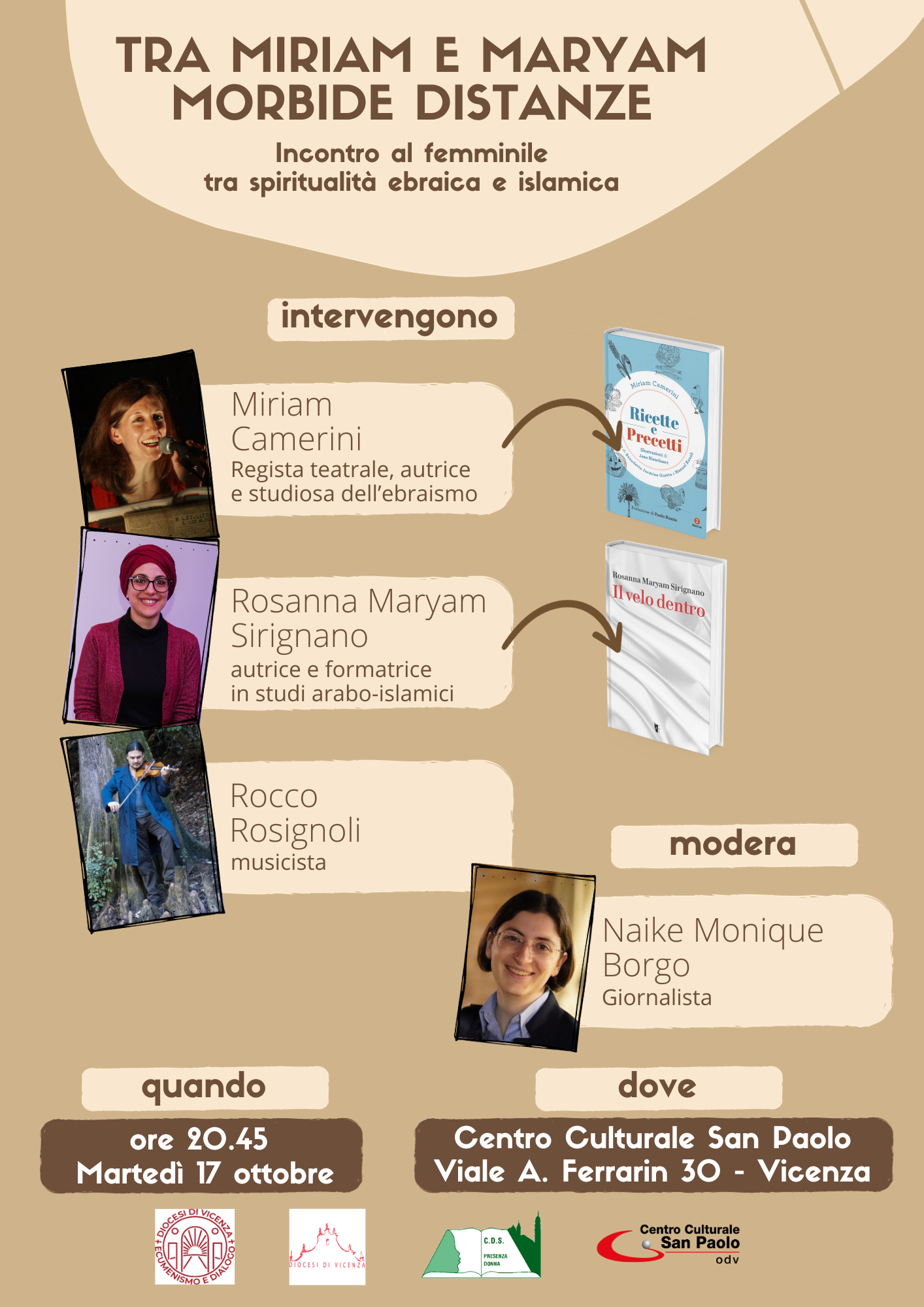 L’incontro al femminile tra spiritualità ebraica e islamica intitolato “Tra Miriam e Maryam morbide distanze” porta a Vicenza Miriam Camerini, regista teatrale, autrice e studiosa dell’ebraismo, e Rosanna Maryam Sirignano, autrice e formatrice in studi arabo-islamici. Saranno accompagnate dal musicista Rocco Rosignoli, mentre la moderazione è affidata a suor Naike Monique Borgo.