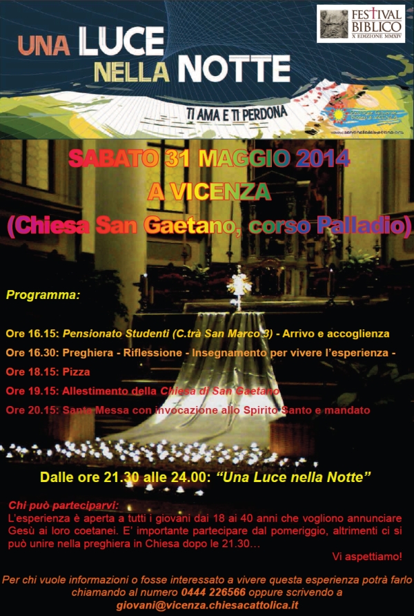 Sabato 31 maggio 2014 la Pastorale Giovanile diocesana ripropone l’esperienza “Una luce nella notte”, momento di spiritualità e di preghiera per i giovani che si tiene nella chiesa di San Gaetano, in corso Palladio a Vicenza, dalle ore 21.30 alle 24.00.