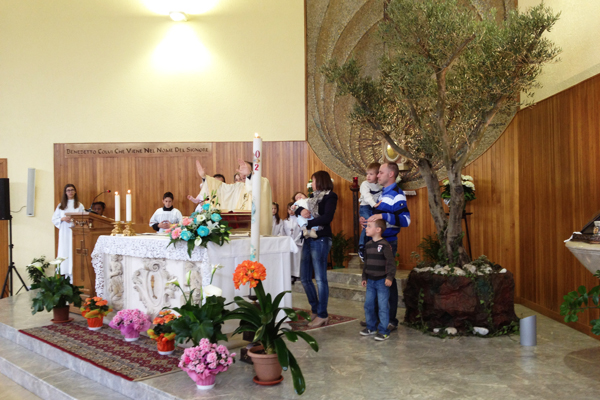Da sinistra: la chiesa parrocchiale di Santa Maria Assunta di Sarego; Santa Messa a Sarego; celebrazione dei Battesimi a Monticello di Fara.