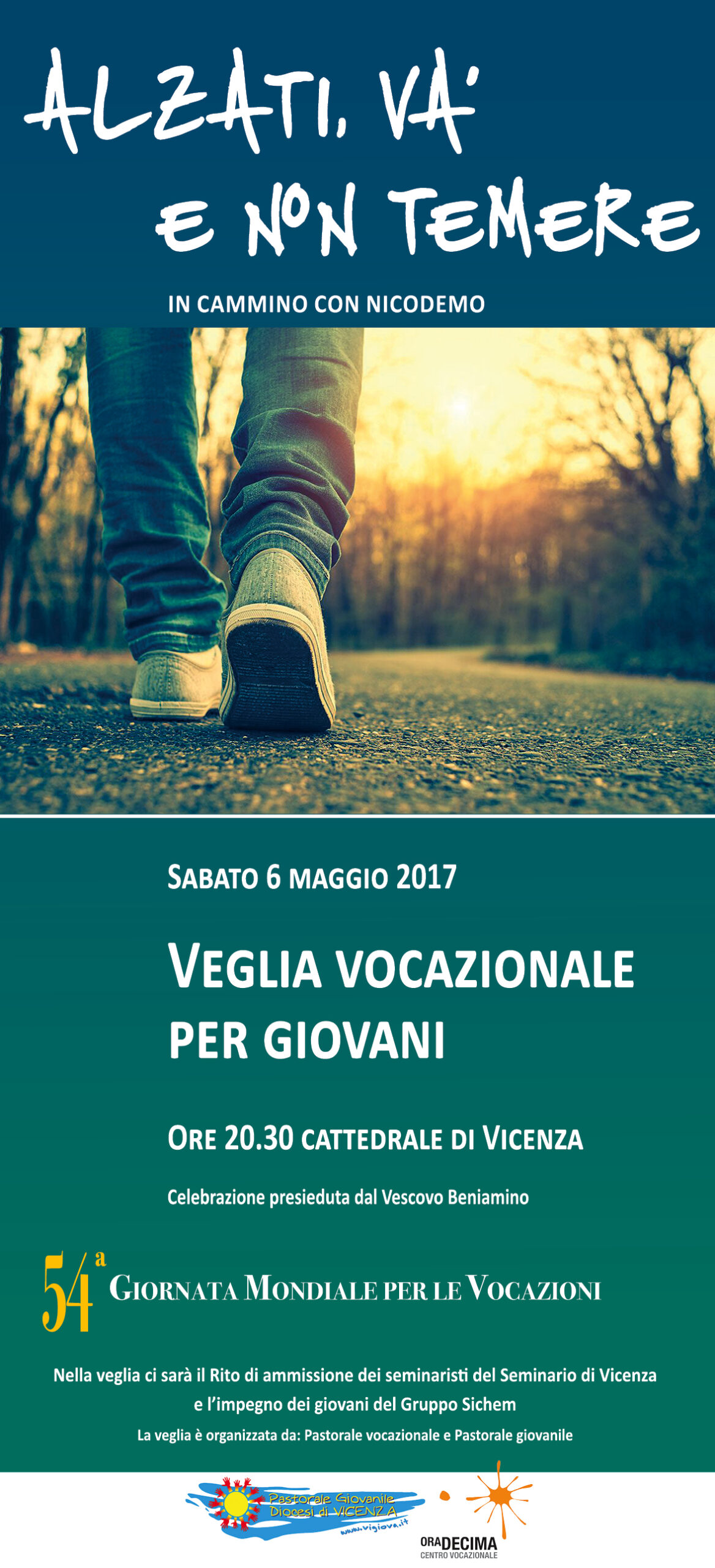Sabato 6 maggio alle ore 20.30 in Cattedrale di Vicenza tutti i giovani della diocesi sono invitati alla VEGLIA VOCAZIONALE PER GIOVANI preparata dal Servizio di Pastorale Giovanile della Diocesi e dal Centro Diocesano per le Vocazioni, che ha come titolo: “Alzati, và e non temere. In Cammino con Nicodemo”.