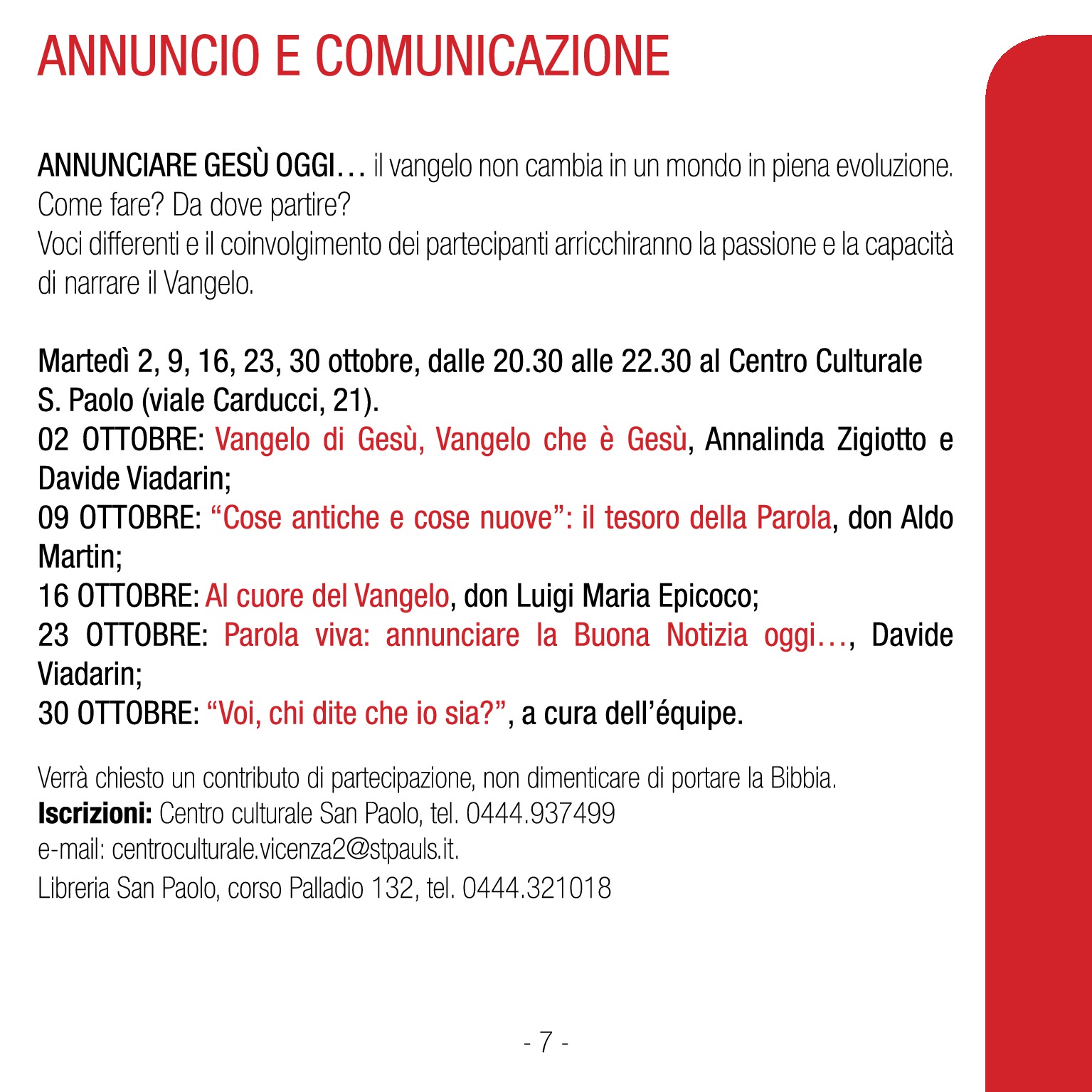 Iscrizioni al Centro Culturale San Paolo: 0444/937499 oppure centroculturale.vicenza2@stpauls.it