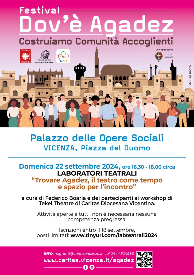 “Trovare Agadez, il teatro come tempo e spazio per l’incontro” è il titolo dei laboratori teatrali promossi nell’ambito del “Dov’è Agadez Festival”. A cura di Federico Boaria e dei partecipanti ai workshop di Tekel Theatre di Caritas Diocesana Vicentina, le attività sono aperte a tutti e non è necessaria nessuna competenza pregressa.