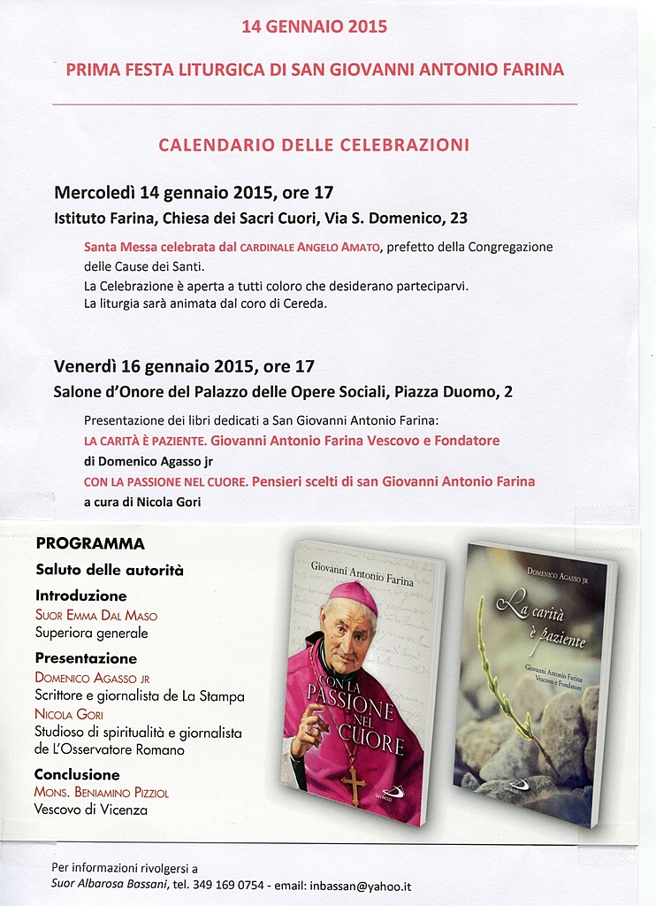 Prima festa liturgica di San Giovanni Antonio Farina: il cardinale Angelo Amato, prefetto della Congregazione delle Cause dei Santi, presiederà la Santa Messa nella Chiesa dei Sacri Cuori dell’Istituto.