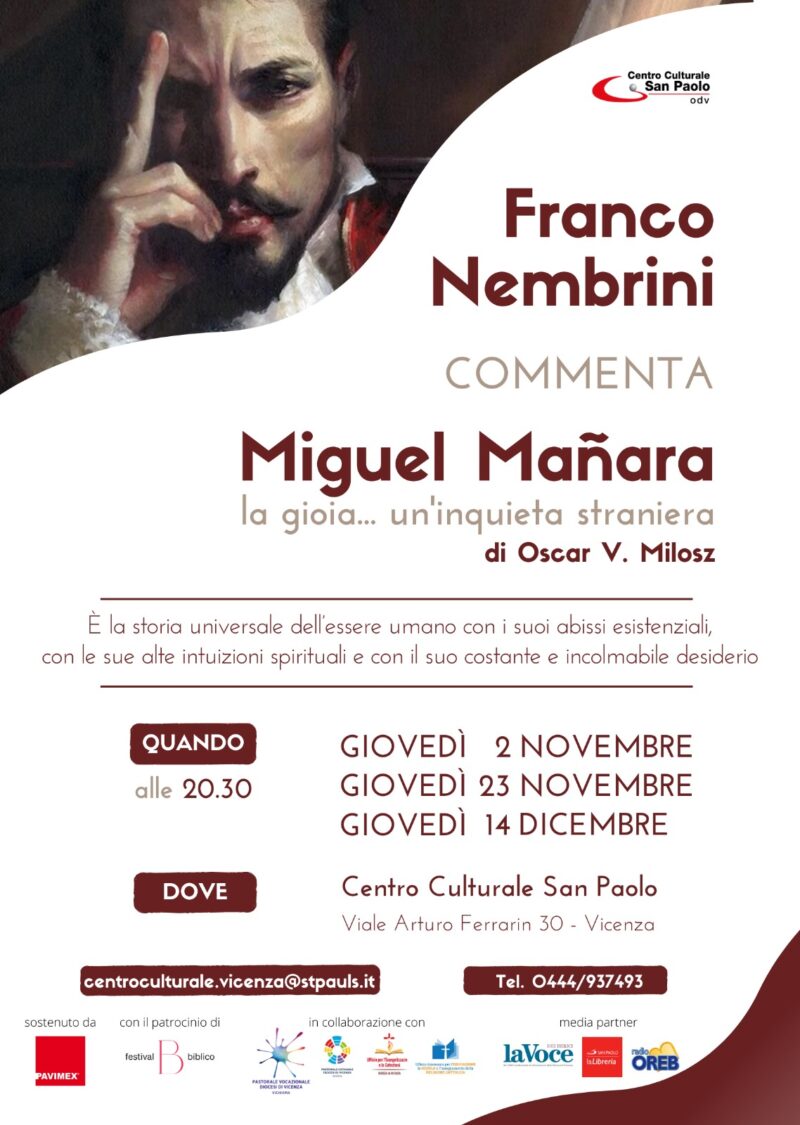 Vengono proposti tre incontri al Centro Culturale San Paolo (2 novembre, 23 novembre e 14 dicembre 2023) nei quali l’autore e professore Nembrini commenta l’opera teatrale “Miguel Mañara” di Oscar V. Milosz.