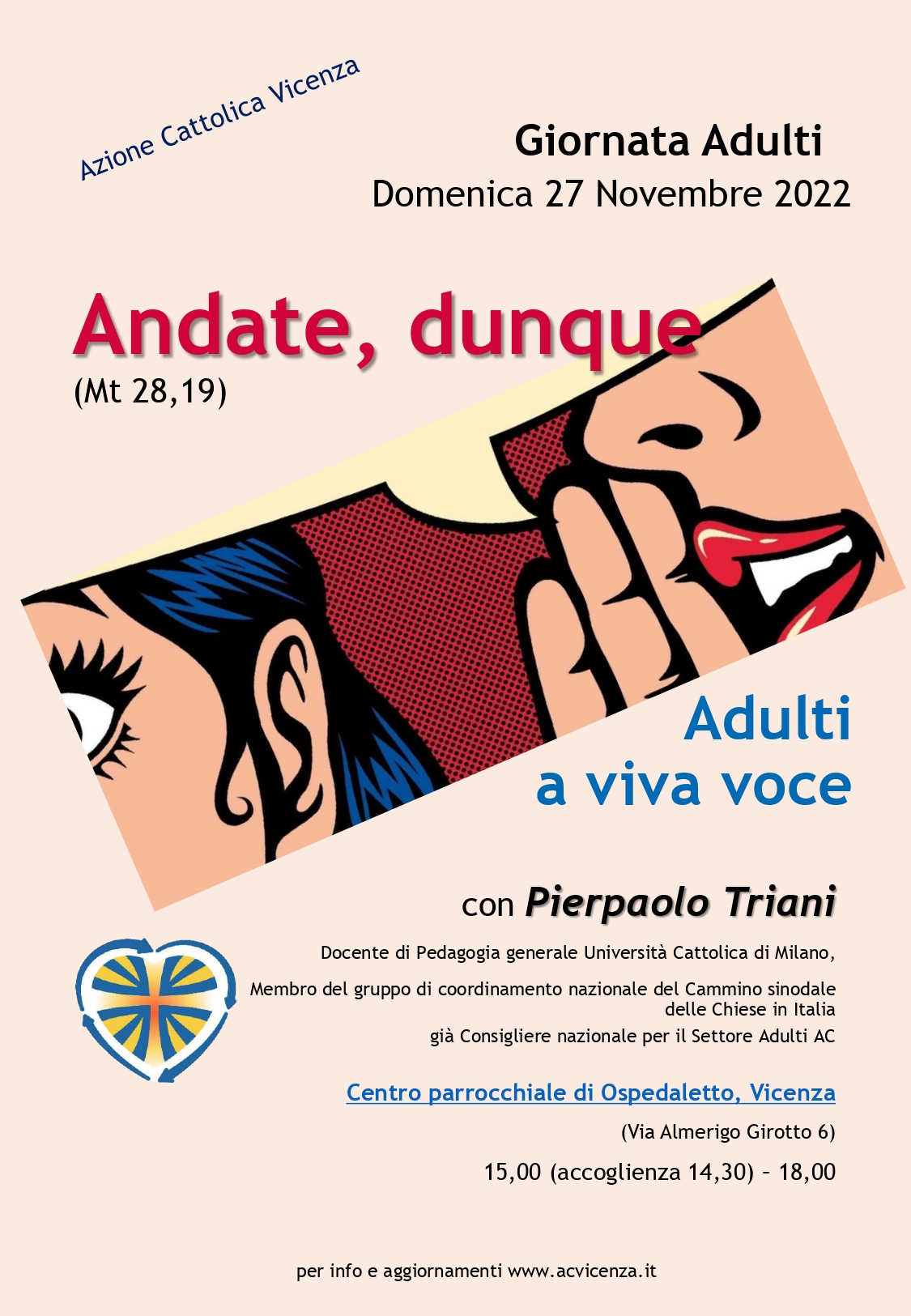 La prima Giornata Adulti promossa dall’Azione Cattolica muove dall’invito che proviene dall’Icona biblica “Andate dunque” (Mt 28,16-20). Ci spinge ad interrogarci su che cosa sta a cuore all’adulto di oggi, a come essere evangelizzatori, testimoni appassionati del nostro essere laici credenti.