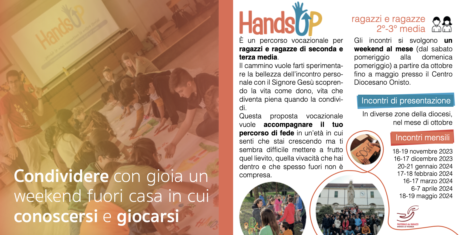 HAND’S UP, proposta vocazionale di un week-end al mese in Centro diocesano dalle 15.30 del sabato alle 15.30 della domenica e messa conclusiva assieme alle famiglie.