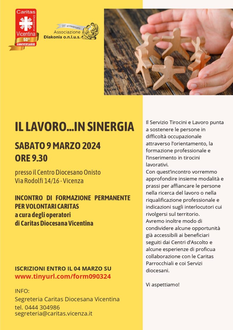 Le iscrizioni all’incontro vanno fatte entro il 4 marzo al link www.tinyurl.com/form090324 o contattando la segreteria (tel. 0444-304986; e-mail: segreteria@caritas.vicenza.it – Orario dal lunedì al venerdì 9.00-13.00).