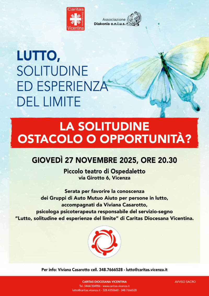Giovedì 27 novembre alle 20.30, il Piccolo Teatro di Ospedaletto (via Girotto 6, Vicenza) ospiterà una serata per favorire la conoscenza dei Gruppi di Auto Mutuo Aiuto per persone in lutto. L’incontro, intitolato “La solitudine, ostacolo o opportunità?”, sarà condotto da Viviana Casarotto, psicologa psicoterapeuta responsabile del servizio-segno “Lutto, solitudine ed esperienza del limite” di Caritas Diocesana Vicentina.