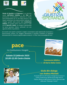 L’Azione Cattolica vicentina ed il MEIC all’interno del percorso eVENTI di PACE propongono per il 22 febbraio “Parole di Giustizia e speranza”. L’incontro sarà al Centro Diocesano Onisto dalle 10,00 alle 12,00. La lectio sarà a cura di Dario Dalla Costa ed il dialogo con Andrea Michieli, direttore dell’Istituto di Diritto internazionale della pace “Giuseppe Toniolo”.
