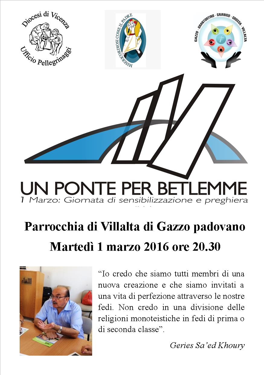 Un “Ponte per Betlemme” è il nome della giornata internazionale che si celebra ogni 1 marzo, allo scopo di sensibilizzare l’opinione pubblica e pregare affinchè venga abbattuto il muro che divide Israele e Palestina. Da qualche tempo anche in Diocesi di Vicenza l’Ufficio Pellegrinaggi organizza la preghiera che quest’anno sarà martedì 1 marzo presso la parrocchia di Villalta (Gazzo Padovano) alle ore 20,30