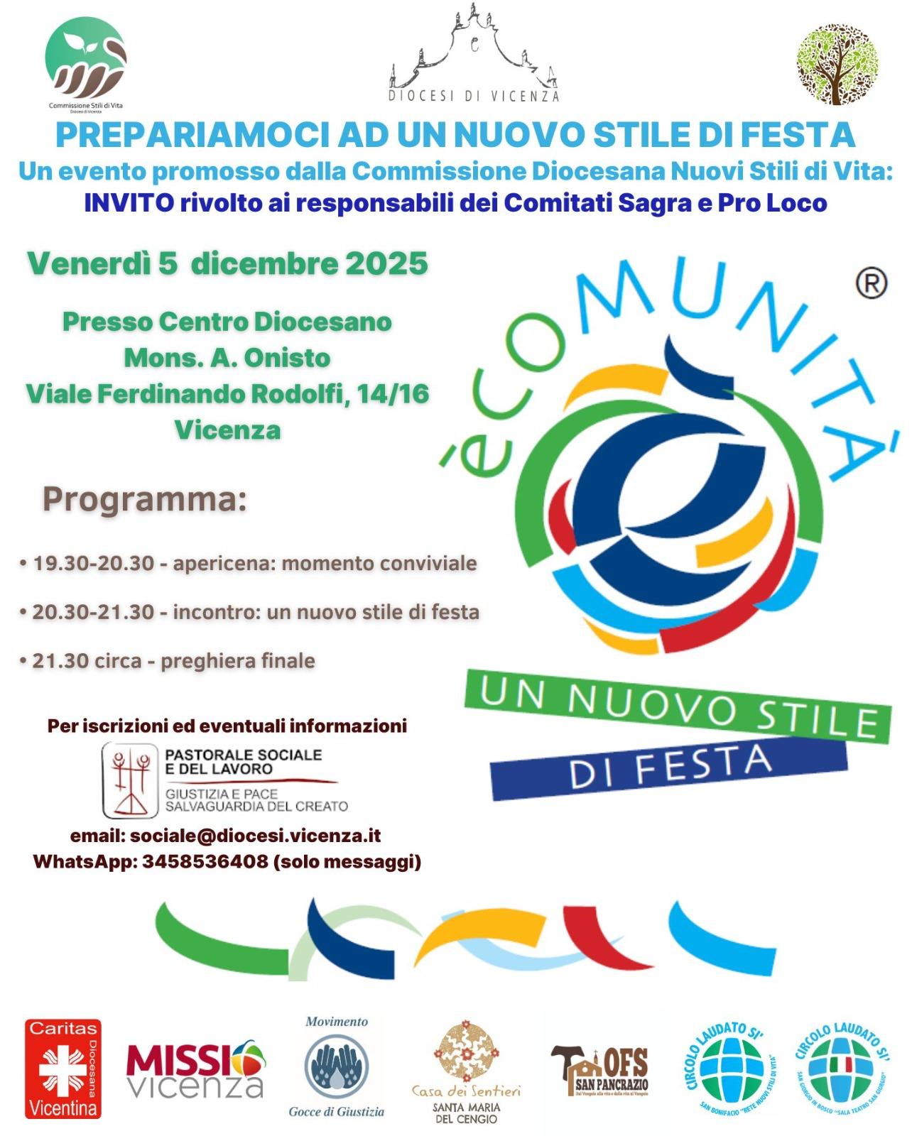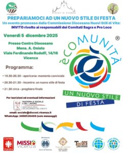L’équipe Stili di Vita del Servizio della Pastorale Sociale della nostra Diocesi venerdì 5 dicembre dalle ore 18.00 alle 22.00 organizza al Centro Onisto di Via Rodolfi 14-16 a Vicenza un incontro dal titolo “Prepariamoci ad un nuovo stile di Festa”.