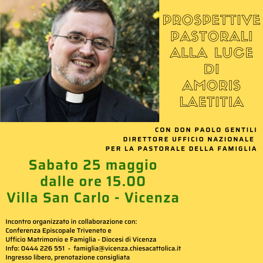 L’ufficio Matrimoni e Famiglia, assieme alla Conferenza Episcopale del Triveneto per la Pastorale della Famiglia, hanno il piacere di invitarvi all’incontro “Prospettive Pastorali alla luce di Amoris Laetitia” con don Paolo Gentili, che si svolgerà sabato 25 maggio a partire dalle ore 15.00 presso Villa San Carlo a Costabissara.
