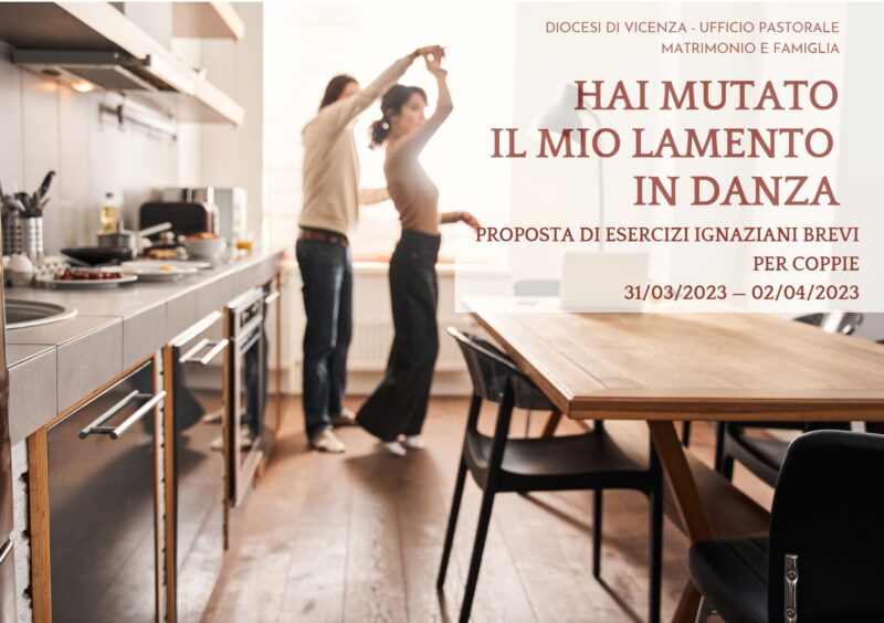 Annuncio, Matrimonio e Famiglia 14 Febbraio 2023 mtoffanello sabato 1 Aprile 00:00 Hai mutato il mio lamento in Danza – Proposta di esercizi ignaziani brevi per coppieInizio: 01/04/2023 00:00